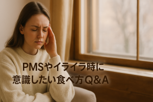 PMSやイライラ時に意識したい食べ方Q&A~「またイライラしてる…」と思ったときに Q. PMSやイライラが強いとき、食べ方でまず意識したいことは何ですか? A. いちばん意識してほしいのは、「血糖値のジェットコ …